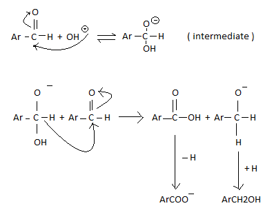 The cannizzaro reaction is a redox reaction. Two molecules ( aliphatic and aromatic aldehydes ) of an aldehyde are reacted to produce a alcohol and carboxylic acid in the presence of strong base.