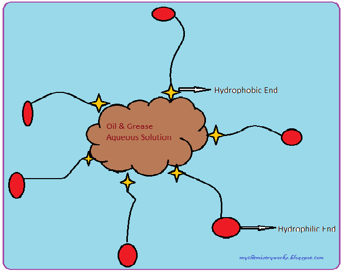 into a grease to forming micelles around oil droplets. The hydrophobic ends of the soap molecules attached towards the grease while the hydrophilic ends of the soap face outward into the water, resulting is an emulsion of soapy grease particles suspended in the water. Then the oily particles are easily washed away. The water agitation can help to clean greasy and oil. The micelles are dispersed into the water.